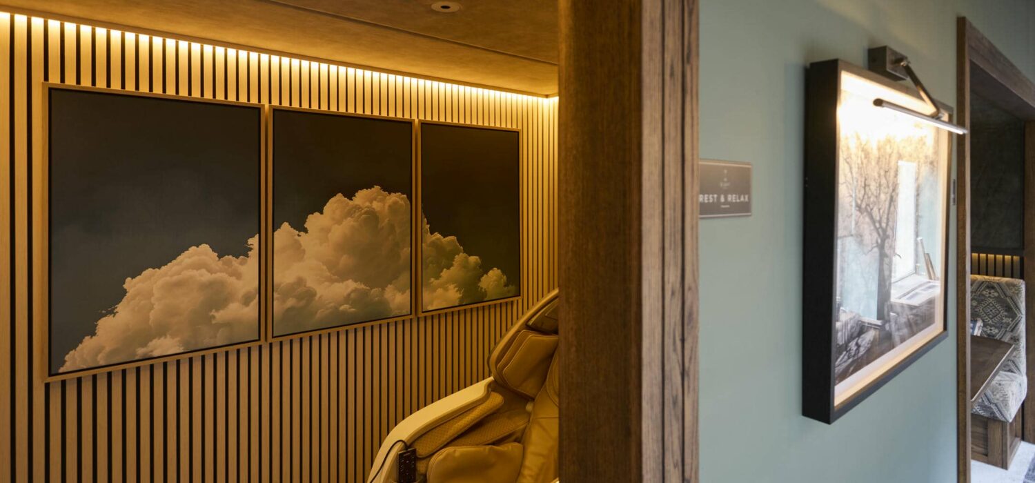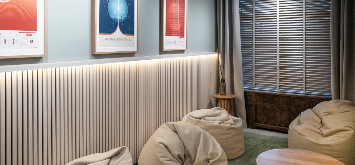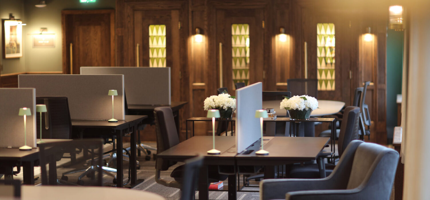 A dedicated and fully flexible co-working area. Members have exclusive access to desks available to book, soundproofed meeting booths, podcast studios, a relaxation/massage pod, and a self-service communal dining area.